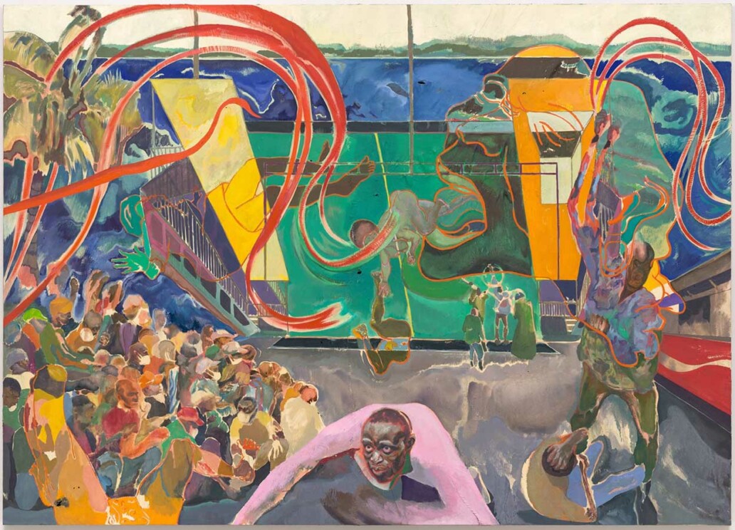 Based in the U.K but born in Kenya, Michael Armitage mainly paints on a Lubugo, a traditional bark cloth from Uganda. His artwork is mainly an iconography of the history of East Africa and the cultural practices of the region.